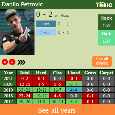 The Serbian has a 0-2 win-loss record in 2021, 0-0 on clay (See FULL STATS).