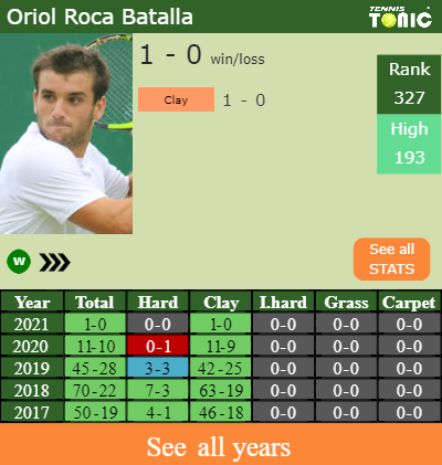 Roca Batalla has a solid record in the last 9 years having won 65% of his matches (424-227). 1-0 on clay in 2021. Talking about his performance on the same surface of this competition, Roca Batalla has a 349-177 match record in the last 9 years on clay.