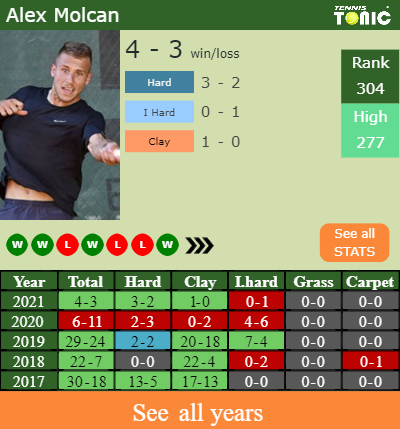 Molcan has a winning match record in the last 8 years having won 59% of his matches (138-95). 1-0 on clay in 2021. In connection with his performance on the same surface of this tournament, Molcan has a 79-53 record in the last 8 years on clay.