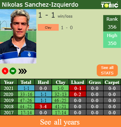 Nikolas has a 1-1 win-loss record in 2021, 1-0 on clay (See FULL STATS).