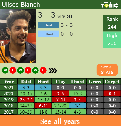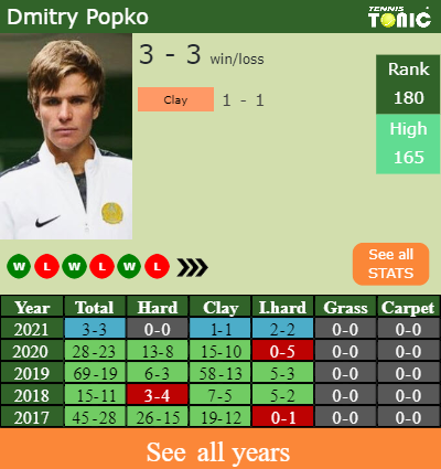 This will be the 2nd time that Dmitry Popko and Ulises Blanch clash against each other. The head to head is 1-0 for Popko (see full H2H stats), but they have never played each other on indoor hard courts.