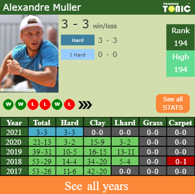 Muller has a 3-3 win-loss record in 2021, 0-0 on indoor hard courts (See FULL STATS).
