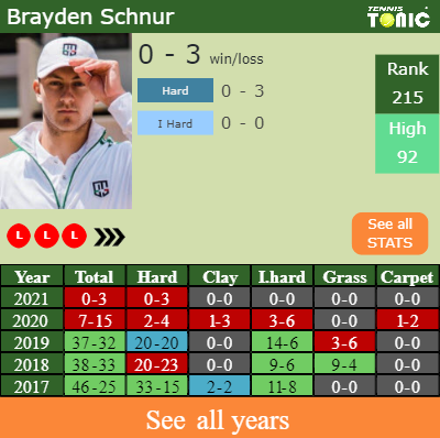 The Canadian has a 0-3 win-loss record in 2021, 0-0 on indoor hard courts (See FULL STATS).