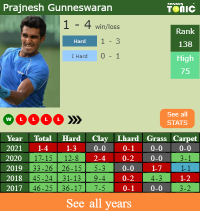 Prajnesh has a 1-4 win-loss record in 2021, 0-1 on indoor hard courts (See FULL STATS).