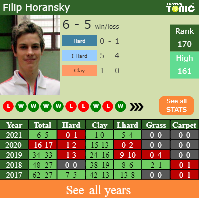 Horansky has a solid match record in the last 10 years having won 60% of his matches (366-240). 1-0 on clay in 2021. In connection with his performance on the same surface of this competition, Horansky has a 262-135 win-loss record in the last years on clay.