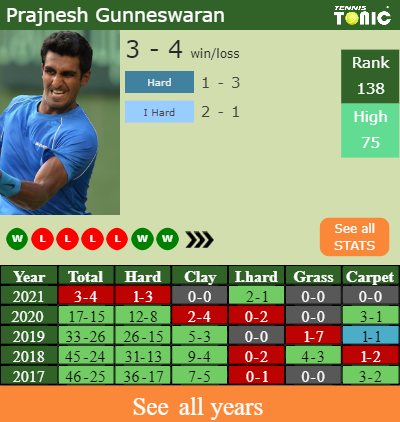 Gunneswaran has a solid record in the last 10 years having won 63% of his matches (258-152). 2-1 on indoor hard courts in 2021. In connection with his performance on the same surface of this event, Gunneswaran has a 7-12 record in the last years on indoor hard courts.