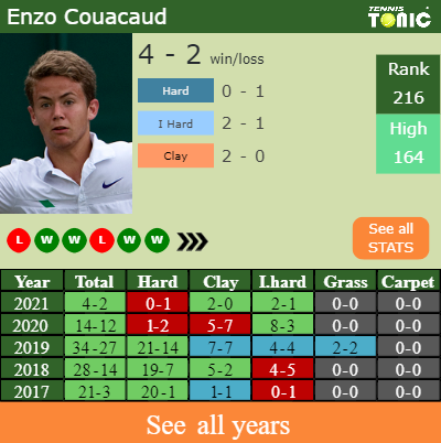 Couacaud has a 4-2 win-loss record in 2021, 2-0 on clay (See FULL STATS).