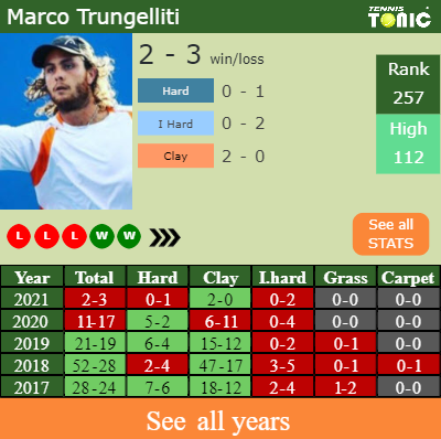 The Argentine has a 2-3 win-loss record in 2021, 2-0 on clay (See FULL STATS).