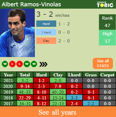 The Spaniard has a 3-2 win-loss record in 2021, 2-0 on clay (See FULL STATS).