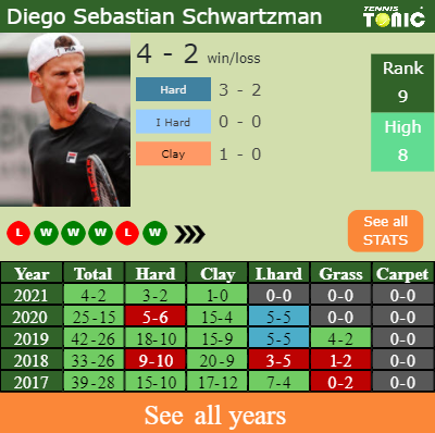 Schwartzman has a solid match record in the last 10 years having won 62% of his matches (374-228). 1-0 on clay in 2021. Talking about his performance on the same surface of this event, Schwartzman has a 277-132 record in the last years on clay.