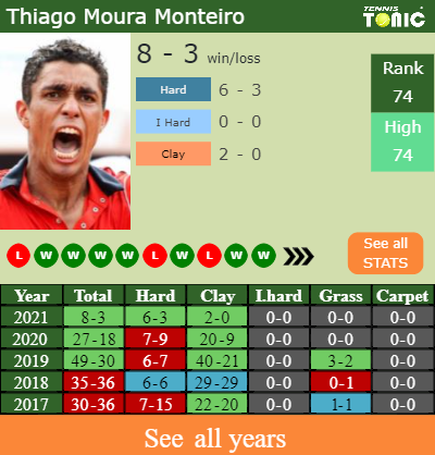 Moura Monteiro has a positive win-loss record in the last 10 years having won 59% of his matches (354-241). 2-0 on clay in 2021. In connection with his performance on the same surface of this event, Moura Monteiro has a 291-178 record in the last years on clay.