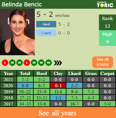 Bencic has a 5-2 win-loss record in 2021, 5-2 on hard (See FULL STATS).