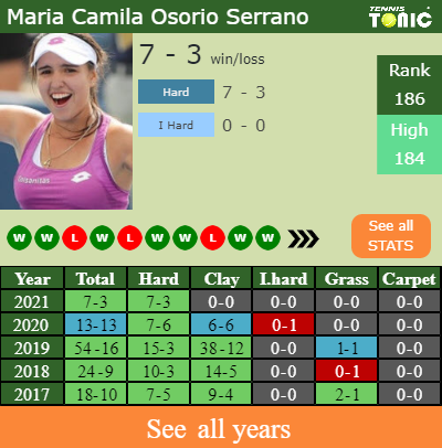 Camila Osorio Serrano has a 7-3 win-loss record in 2021, 7-3 on hard (See FULL STATS).