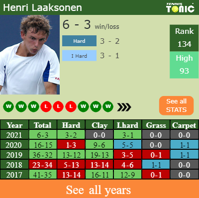 Laaksonen has a favorable record in the last 10 years having won 56% of his matches (340-268). 3-1 on indoor hard courts in 2021. Regarding his performance on the same surface of this tournament, Laaksonen has a 96-64 win-loss record in the last years on indoor hard courts.