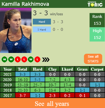 Rakhimova has a 3-3 win-loss record in 2021, 0-0 on indoor hard courts (See FULL STATS).