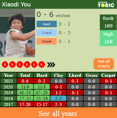 Xiaodi has a 0-6 win-loss record in 2021, 0-3 on indoor hard courts (See FULL STATS).