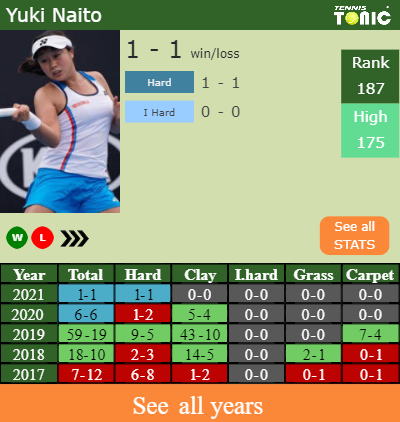 Naito has a 1-1 win-loss record in 2021, 0-0 on indoor hard courts (See FULL STATS).