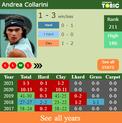 Collarini has a 1-3 win-loss record in 2021, 1-2 on clay (See FULL STATS).