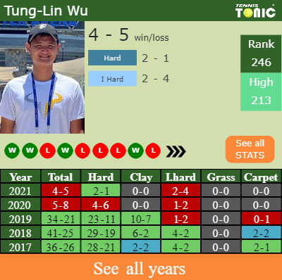 In terms of his career, Tung-Lin has an overall 136-102 record. He has a negative 12-13 record on indoor hard courts.