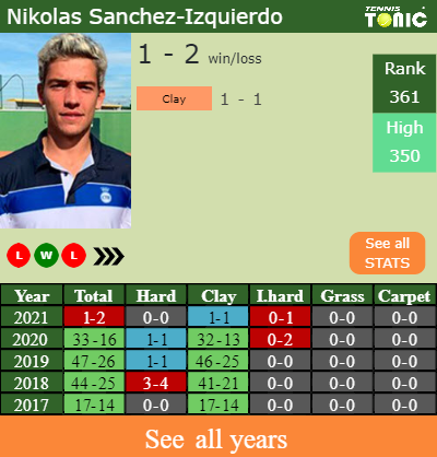 In terms of his career, Sanchez-Izquierdo has an overall 142-83 record. He has a positive 137-74 record on clay.
