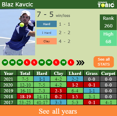Kavcic has a 7-5 win-loss record in 2021, 4-2 on clay (See FULL STATS).