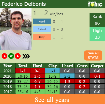 Federico has a 1-2 win-loss record in 2021, 1-1 on clay (See FULL STATS).
