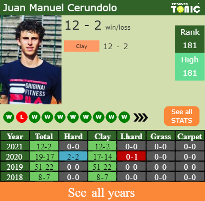 The Argentine has a 12-2 win-loss record in 2021, 12-2 on clay (See FULL STATS).