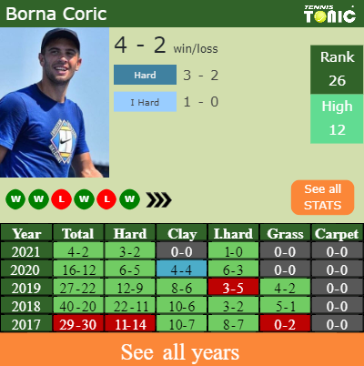 Coric has a 4-2 win-loss record in 2021, 1-0 on indoor hard courts (See FULL STATS).