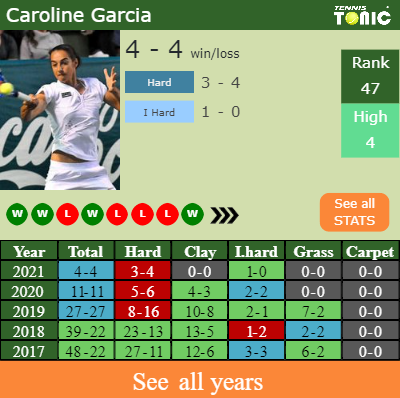 Garcia has a good win-loss record in the last 10 years having won 57% of her matches (290-221). 1-0 on indoor hard courts in 2021. In connection with her performance on the same surface of this tournament, Garcia has a 31-22 win-loss record in the last years on indoor hard courts.