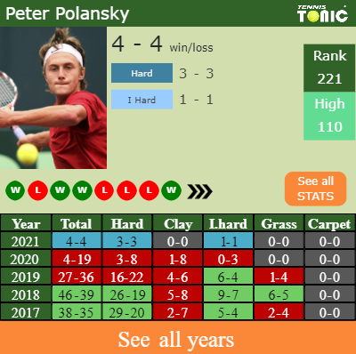 Polansky has a 4-4 win-loss record in 2021, 1-1 on indoor hard courts (See FULL STATS).