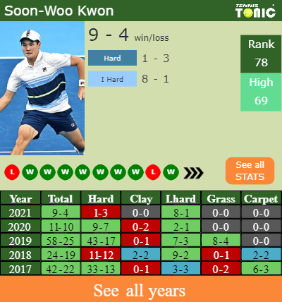 Kwon has a solid match record in the last 8 years having won 63% of his matches (215-124). 8-1 on indoor hard courts in 2021. Regarding his performance on the same surface of this tournament, Kwon has a 30-12 record in the last 8 years on indoor hard courts.