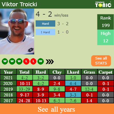 Troicki has a 4-2 win-loss record in 2021, 1-0 on indoor hard courts (See FULL STATS).