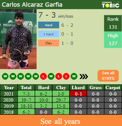 Alcaraz Garfia has a fantastic record in the last 4 years having won 76% of his matches (70-22). 1-0 on clay in 2021. In connection with his performance on the same surface of this tournament, Alcaraz Garfia has a 51-17 record in the last 4 years on clay.