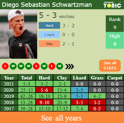 Schwartzman has a 5-3 win-loss record in 2021, 2-1 on clay (See FULL STATS).