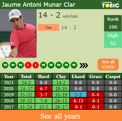 Antoni Munar Clar has a 14-2 win-loss record in 2021, 14-2 on clay (See FULL STATS).