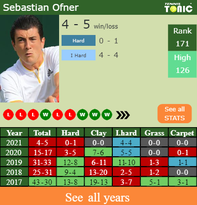 Sebastian has a 4-5 win-loss record in 2021, 4-4 on indoor hard courts (See FULL STATS).