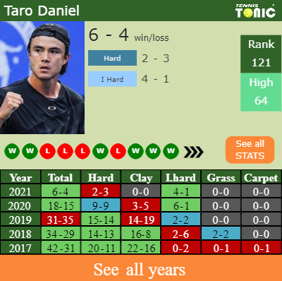 Daniel has a winning record in the last 10 years having won 59% of his matches (380-262). 4-1 on indoor hard courts in 2021. In connection with his performance on the same surface of this event, Daniel has a 38-29 record in the last years on indoor hard courts.