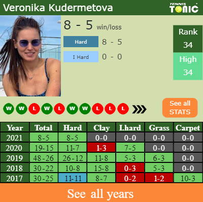 Kudermetova has a 8-5 win-loss record in 2021, 8-5 on hard (See FULL STATS).