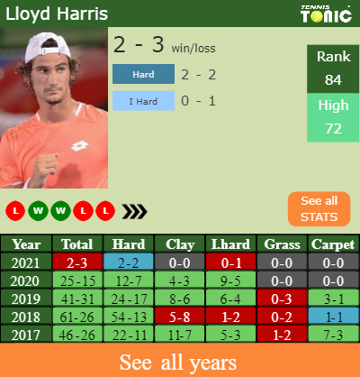 The South African has a 2-3 win-loss record in 2021, 2-2 on hard (See FULL STATS).