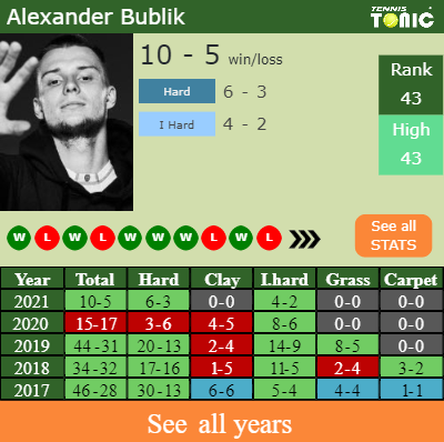 The Kazakhstani has a 10-5 win-loss record in 2021, 6-3 on hard (See FULL STATS).
