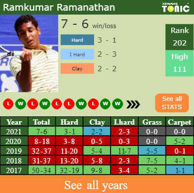 Ramanathan has a 7-6 win-loss record in 2021, 3-1 on hard (See FULL STATS).