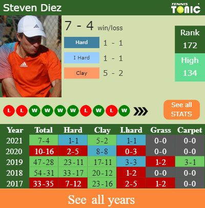 Diez has a 7-4 win-loss record in 2021, 1-1 on indoor hard courts (See FULL STATS).