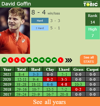 David has a 8-4 win-loss record in 2021, 3-3 on hard (See FULL STATS).