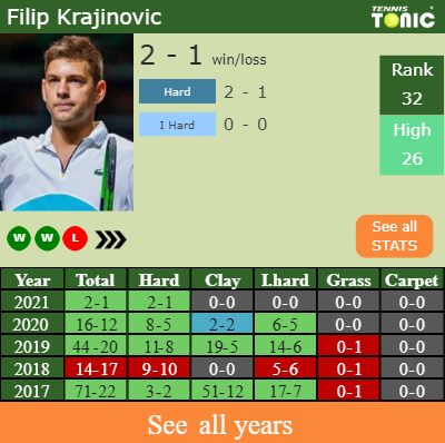 The Serbian has a 2-1 win-loss record in 2021, 2-1 on hard (See FULL STATS).