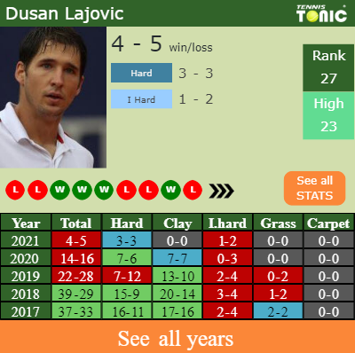 Lajovic has a 4-5 win-loss record in 2021, 3-3 on hard (See FULL STATS).