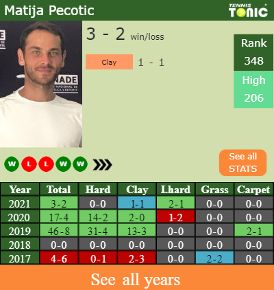 Matija has a 3-2 win-loss record in 2021, 2-1 on indoor hard courts (See FULL STATS).