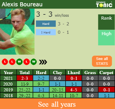 Boureau has a winning match record in the last 4 years having won 54% of his matches (67-56). 2-2 on hard in 2021. Regarding his performance on the same surface of this competition, Boureau has a 16-13 record in the last 4 years on hard.
