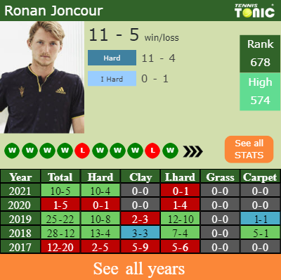 Talking about serving, Joncour wasn’t able to score even 1 ace for the entire match and he was quite steady in conceding no double faults for the entire match. Ronan Joncour conceded no breaks for the entire match to put NAN% of his first serves in, win NAN% (/) of the points behind his 1st serve and NAN% (/) on the 2nd serve.