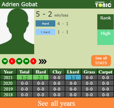Adrien has a 3-2 win-loss record in 2021, 2-1 on hard (See FULL STATS).
