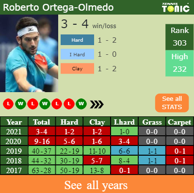 Ortega-Olmedo has a 3-4 win-loss record in 2021, 1-0 on indoor hard courts (See FULL STATS).
